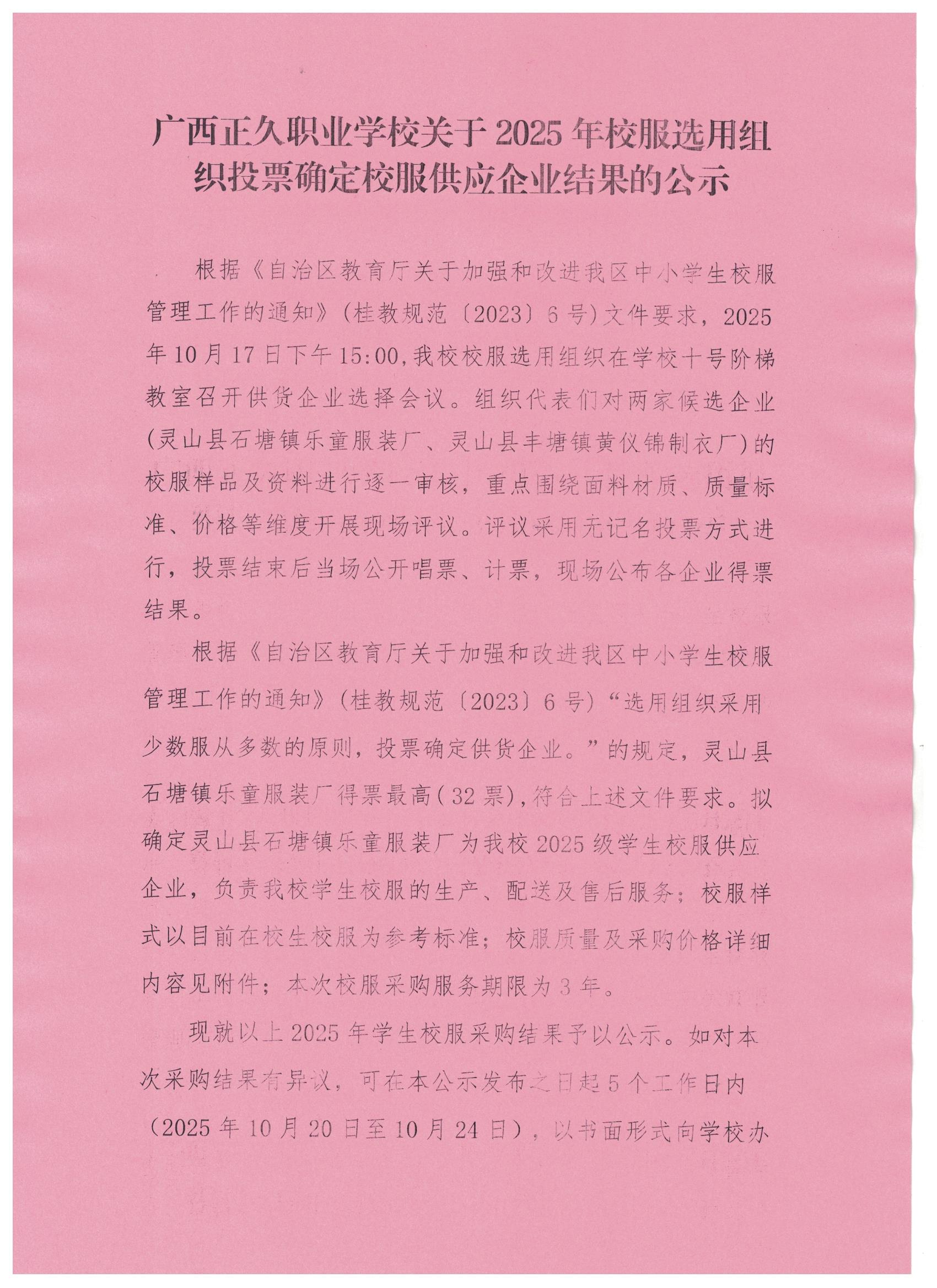 广西正久职业学校关于2025年校服选用组织投票确定校服供应企业结果公示
