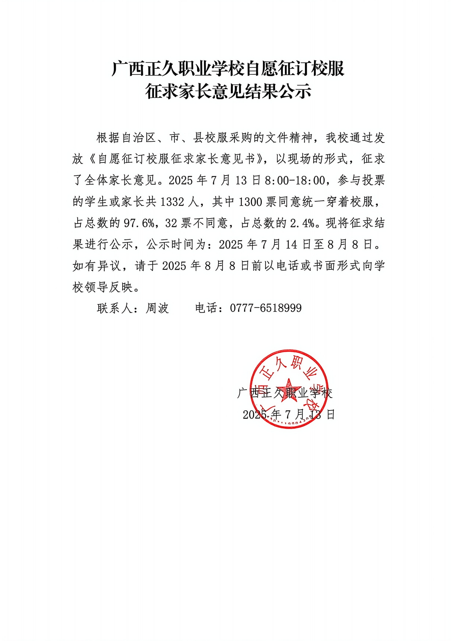 广西正久职业学校自愿征订校服征求家长意见结果公示