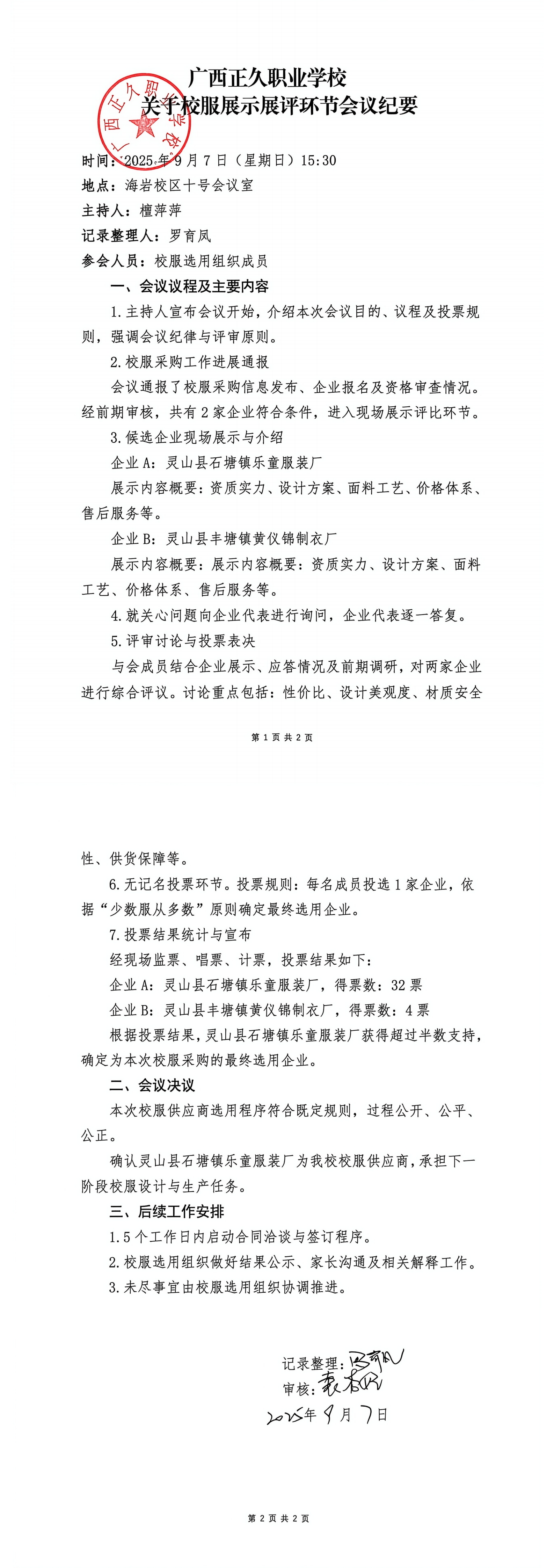 广西正久职业学校关于2025年学生校服采购结果的公示
