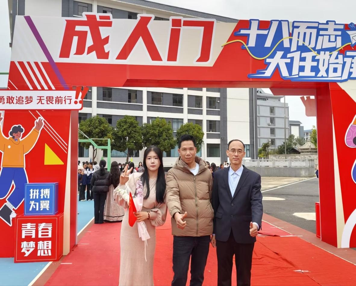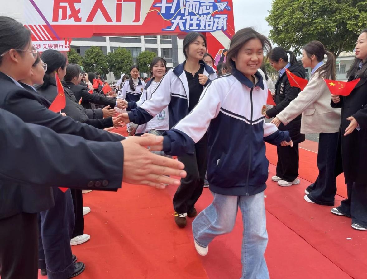 在梦想寄未来,希望共放飞环节,五彩气球腾空而起,承载着青春梦想与美好祝愿飞向蓝天。各班学生以班牌开路,在班主任的带领下,与家长携手并肩,昂首走过象征成长与蜕变的成人门。全体教师在红毯两侧列队,与每一位学子击掌鼓劲,传递温暖与力量。