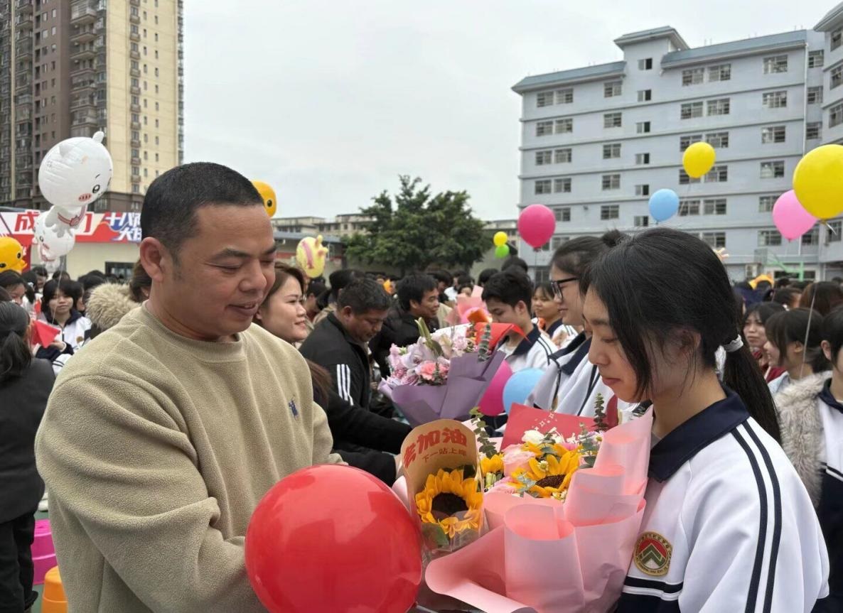 在梦想寄未来,希望共放飞环节,五彩气球腾空而起,承载着青春梦想与美好祝愿飞向蓝天。各班学生以班牌开路,在班主任的带领下,与家长携手并肩,昂首走过象征成长与蜕变的成人门。全体教师在红毯两侧列队,与每一位学子击掌鼓劲,传递温暖与力量。