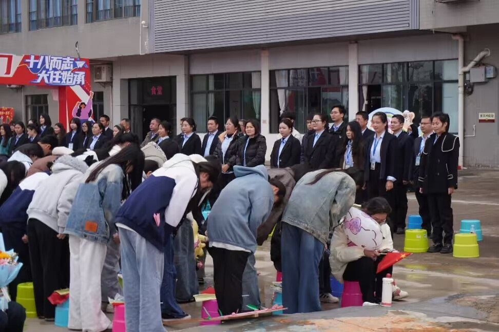 仪式进入成人之礼,梦想起航篇章。全体高三学子整齐列队,以三鞠躬礼致敬成长:一敬国旗,感恩祖国护佑;二敬家长,感恩养育之恩;三敬师长,感恩谆谆教诲。深深一躬,尽显感恩与赤诚。