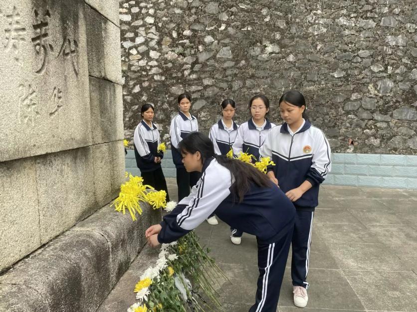 “刻苦勤奋,自强不息,报效祖国,脚踏实地,崇尚科学,努力学习,团结拼搏,永争第一!”铿锵有力的集体宣誓声回荡山间,彰显出广西正久职业学校团员青年立志报国的坚定决心。仪式结束后,师生们依次献上亲手制作的菊花,绕碑瞻仰烈士英名,在追思中感悟革命精神的永恒力量。活动最后,全体师生在纪念碑前合影留念,将这场涤荡心灵的红色教育定格为永恒记忆。